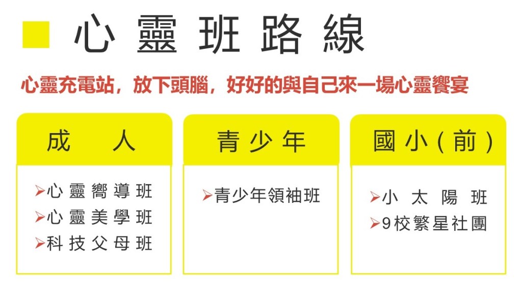 與心靈疏離影響所及包含:失去愛與被愛的能力、易發怒、易疲憊、失去創造力與生命的活力……等,最終反應在身體健康上,生命變得不得不前進的狀態。有鑑於此,生命動能學長姊完成五年552場次921震災區心靈重建活動後,返回彰化市駐紮,與市公所、縣府及文化部等非正式學習場域長期合作,將身心靈成長列為必修課,起初提供個人終身學習,25年來發展為家族共學,形成社會穩定成長的力量。心靈奧秘系列課程的特色,以最自然的方式,調和生活壓力、探索心靈資源、啓發身心智慧、朗現生命潛能,使得有限的生命,發揮無限的價值與意義。