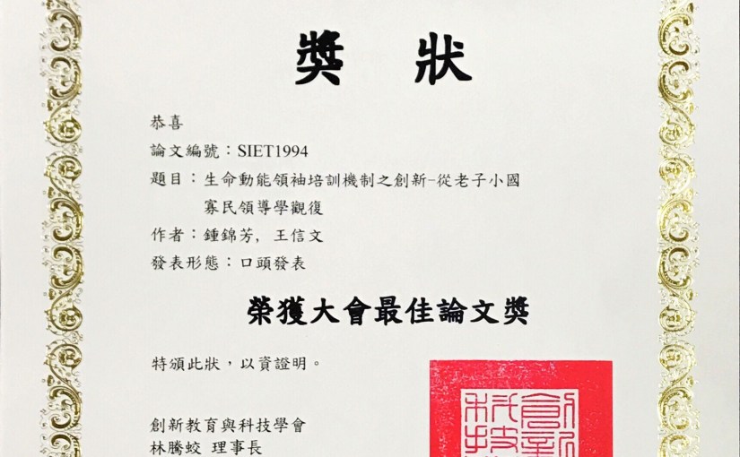 生命動能學術研究獲最佳論文獎 感恩同學們23年堅忍與卓越的故事,生命動能領袖培訓機制榮獲 最佳論文獎 http://www.ba.ncue.edu.tw/front/newscontent.php?index=1&gu=3&id=507&pi=0 十年太極,感恩所有前輩傳承、感恩360位選手千錘百鍊,生命動能心靈太極榮獲優秀獎 http://www.ba.ncue.edu.tw/front/newscontent.php?index=1&gu=0&id=508&pi=0 分享此文: 按一下即可分享至 X(在新視窗中開啟) X 按一下以分享至 Facebook(在新視窗中開啟) Facebook 喜歡 正在載入... 相關